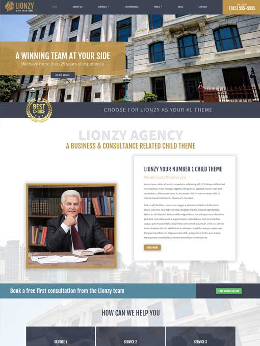 Lionzy comes with a call to action in the menu and a trust icon below the header image. This way your visitors have an easy way to get in touch and it builds up trust which will increase your conversion rate.